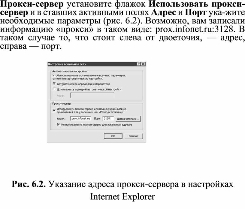 Для этого в главном окне Internet Explorer откройте меню Сервис Свойства обозревателя, в открывшемся окне Свойства обозревателя (см. рис. 6.1) перей-дите на вкладку Подключения и нажмите кнопку Настройка LAN. Откроется окно Настройка локальной сети. В области Прокси-сервер установите флажок Использовать прокси-сервер и в ставших активными полях Адрес и Порт ука-жите необходимые параметры (рис. 6.2). Возможно, вам записали информацию «прокси» в таком виде: prox.infonet.ru:3128. В таком случае то, что стоит слева от двоеточия, — адрес, справа — порт.