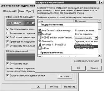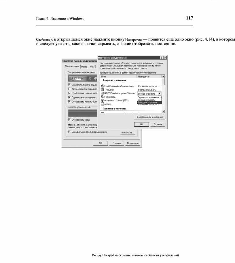 Свойства), в открывшемся окне нажмите кнопку Настроить — появится еще одно окно (рис. 4.14), в котором и следует указать, какие значки скрывать, а какие отображать постоянно.