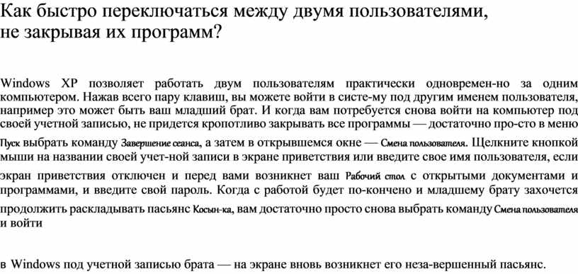 Windows XP позволяет работать двум пользователям практически одновремен-но за одним компьютером. Нажав всего пару клавиш, вы можете войти в систе-му под другим именем пользователя, например это может быть ваш младший брат. И когда вам потребуется снова войти на компьютер под своей учетной записью, не придется кропотливо закрывать все программы — достаточно про-сто в меню Пуск выбрать команду Завершение сеанса, а затем в открывшемся окне — Смена пользователя. Щелкните кнопкой мыши на названии своей учет-ной записи в экране приветствия или введите свое имя пользователя, если экран приветствия отключен и перед вами возникнет ваш Рабочий стол с открытыми документами и программами, и введите свой пароль. Когда с работой будет по-кончено и младшему брату захочется продолжить раскладывать пасьянс Косын-ка, вам достаточно просто снова выбрать команду Смена пользователя и войти