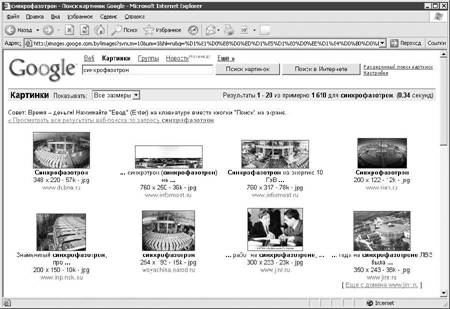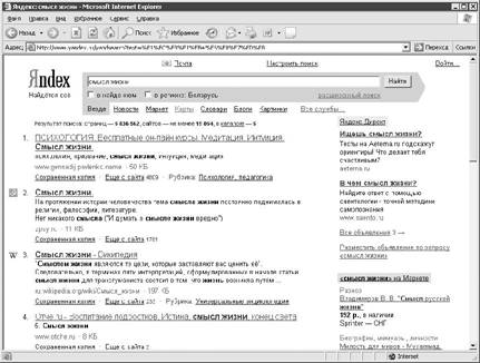 «Яндекс» считается лучшей поисковой системой «Рунета». Введите запрос в поисковую строку, нажмите кнопку Найти — и через короткое время за-грузится страница со списком результатов (рис. 6.11). Искать можно не только сайты, но и картинки или определения в словарях (для этого суще-ствуют соответствующие ссылки).