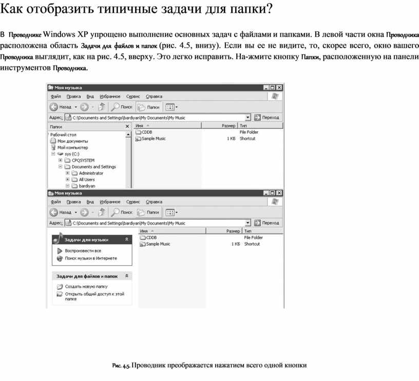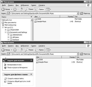 В Проводнике Windows XP упрощено выполнение основных задач с файлами и папками. В левой части окна Проводника расположена область Задачи для файлов и папок (рис. 4.5, внизу). Если вы ее не видите, то, скорее всего, окно вашего Проводника выглядит, как на рис. 4.5, вверху. Это легко исправить. На-жмите кнопку Папки, расположенную на панели инструментов Проводника.