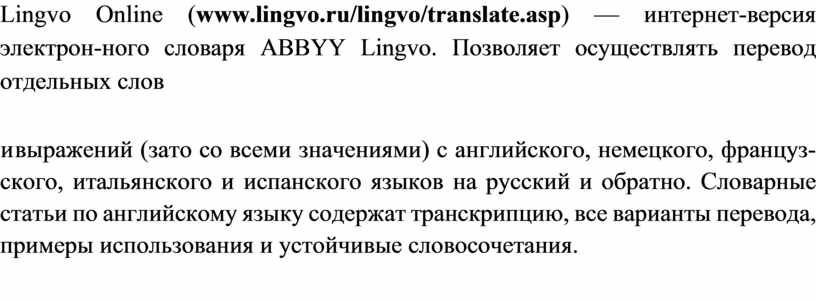 Lingvo Online (www.lingvo.ru/lingvo/translate.asp) — интернет-версия электрон-ного словаря ABBYY Lingvo. Позволяет осуществлять перевод отдельных слов