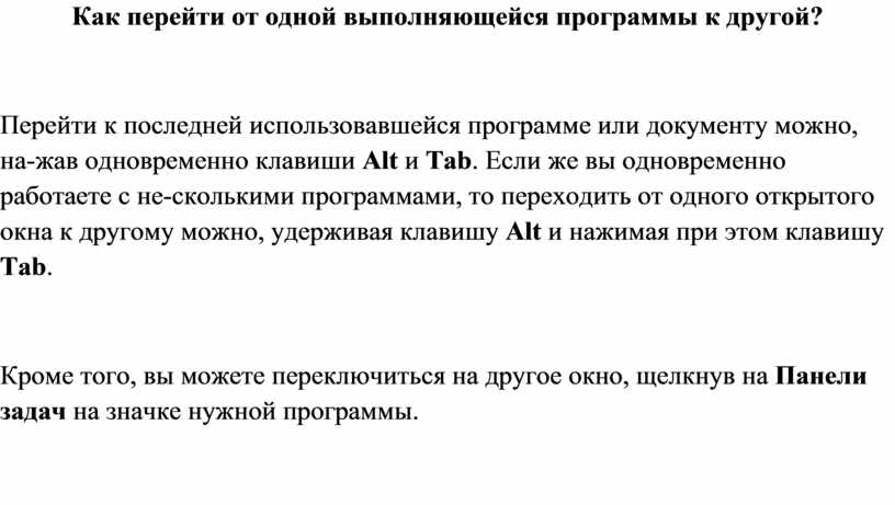 Перейти к последней использовавшейся программе или документу можно, на-жав одновременно клавиши Alt и Tab. Если же вы одновременно работаете с не-сколькими программами, то переходить от одного открытого окна к другому можно, удерживая клавишу Alt и нажимая при этом клавишу Tab.