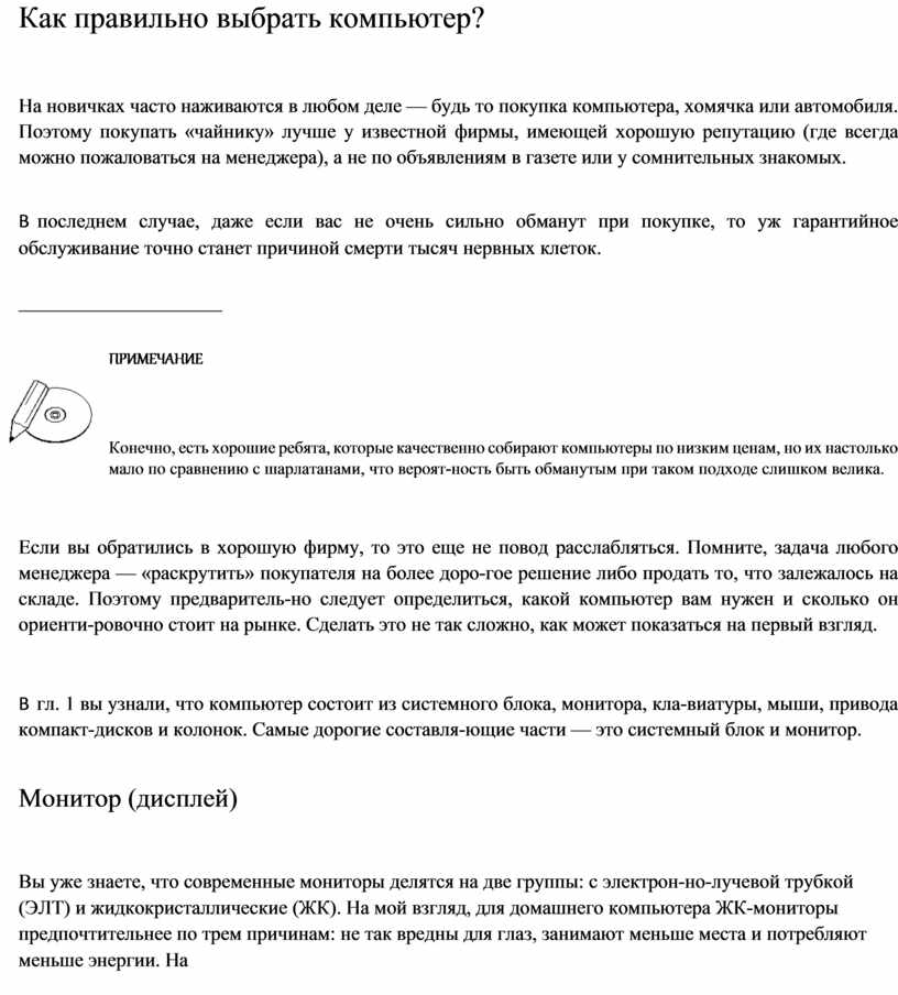 Если вы обратились в хорошую фирму, то это еще не повод расслабляться. Помните, задача любого менеджера — «раскрутить» покупателя на более доро-гое решение либо продать то, что залежалось на складе. Поэтому предваритель-но следует определиться, какой компьютер вам нужен и сколько он ориенти-ровочно стоит на рынке. Сделать это не так сложно, как может показаться на первый взгляд.