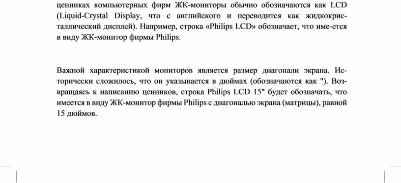 Важной характеристикой мониторов является размер диагонали экрана. Ис-торически сложилось, что он указывается в дюймах (обозначаются как "). Воз-вращаясь к написанию ценников, строка Philips LCD 15" будет обозначать, что имеется в виду ЖК-монитор фирмы Philips с диагональю экрана (матрицы), равной 15 дюймов.