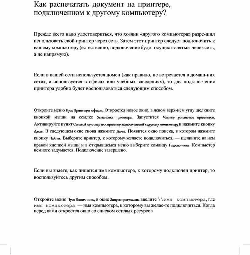 Прежде всего надо удостовериться, что хозяин «другого компьютера» разре-шил использовать свой принтер через сеть. Затем этот принтер следует под-ключить к вашему компьютеру (естественно, подключение будет осуществ-ляться через сеть, а не напрямую).