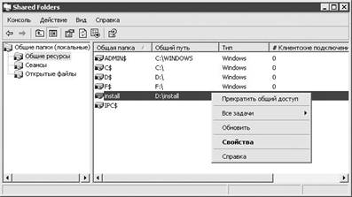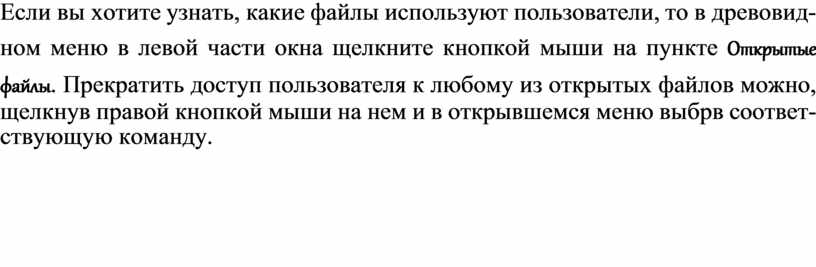 Если вы хотите узнать, какие файлы используют пользователи, то в древовид-ном меню в левой части окна щелкните кнопкой мыши на пункте Открытые файлы. Прекратить доступ пользователя к любому из открытых файлов можно, щелкнув правой кнопкой мыши на нем и в открывшемся меню выбрв соответ-ствующую команду.