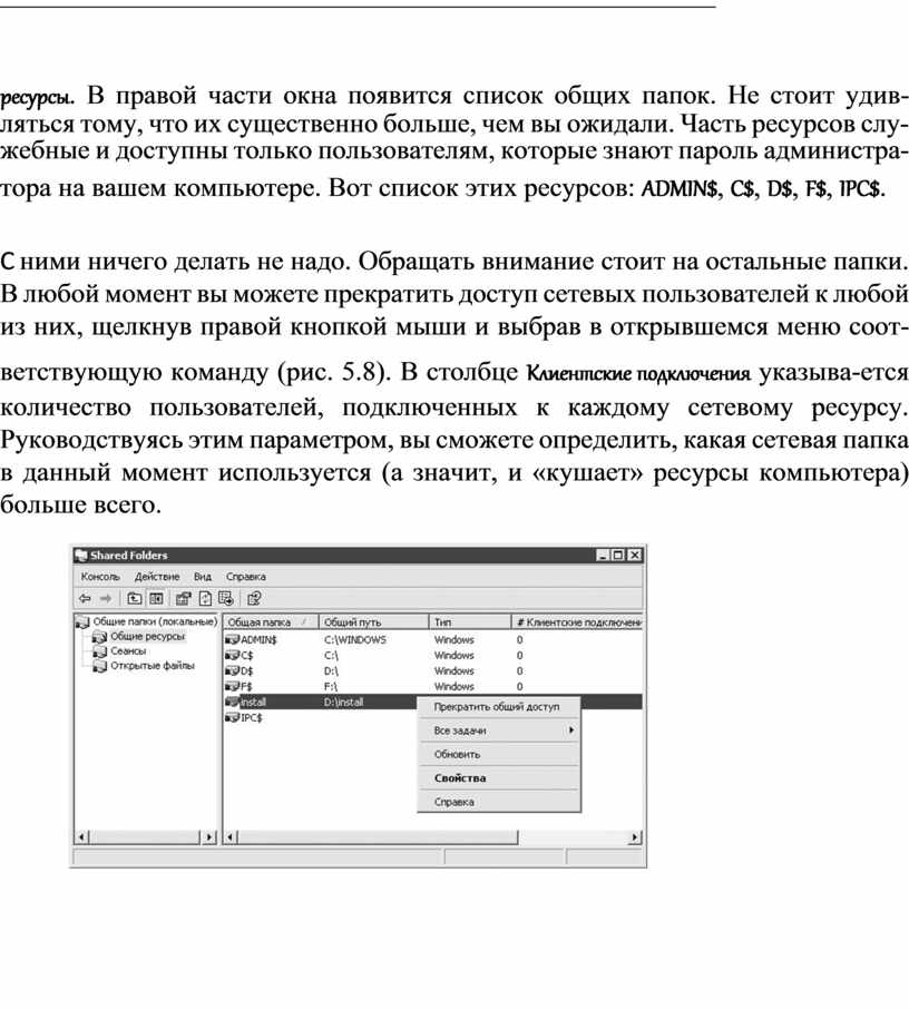 С ними ничего делать не надо. Обращать внимание стоит на остальные папки. В любой момент вы можете прекратить доступ сетевых пользователей к любой из них, щелкнув правой кнопкой мыши и выбрав в открывшемся меню соот-ветствующую команду (рис. 5.8). В столбце Клиентские подключения указыва-ется количество пользователей, подключенных к каждому сетевому ресурсу. Руководствуясь этим параметром, вы сможете определить, какая сетевая папка в данный момент используется (а значит, и «кушает» ресурсы компьютера) больше всего.