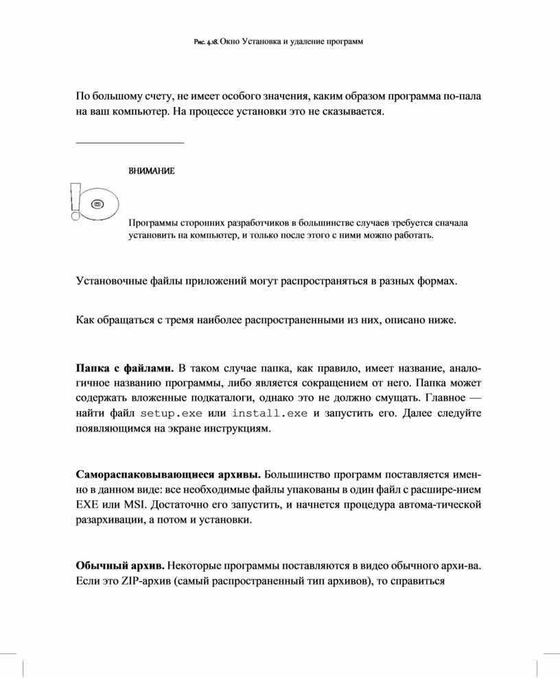 Самораспаковывающиеся архивы. Большинство программ поставляется имен-но в данном виде: все необходимые файлы упакованы в один файл с расшире-нием EXE или MSI. Достаточно его запустить, и начнется процедура автома-тической разархивации, а потом и установки.
