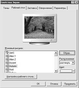 Откройте Панель управления, найдите там компонент Экран и два раза щелкните кнопкой мыши на его значке. В открывшемся окне перейдите на вкладку Рабочий стол (рис. 3.14) и нажмите кнопку Обзор. Выберите фото-графию или картинку, которую хотите установить на Рабочий стол, и на-жмите кнопку Открыть.
