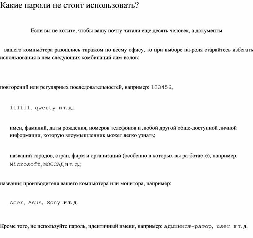 вашего компьютера разошлись тиражом по всему офису, то при выборе па-роля старайтесь избегать использования в нем следующих комбинаций сим-волов: