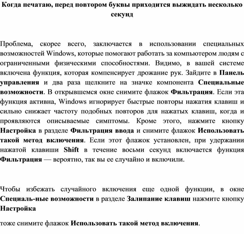 Проблема, скорее всего, заключается в использовании специальных возможностей Windows, которые помогают работать за компьютером людям с ограниченными физическими способностями. Видимо, в вашей системе включена функция, которая компенсирует дрожание рук. Зайдите в Панель управления и два раза щелкните на значке компонента Специальные возможности. В открывшемся окне снимите флажок Фильтрация. Если эта функция активна, Windows игнорирует быстрые повторы нажатия клавиш и сильно снижает частоту подобных повторов для нажатых клавиш, когда и проявляются описываемые симптомы. Кроме этого, нажмите кнопку Настройка в разделе Фильтрация ввода и снимите флажок Использовать такой метод включения. Если этот флажок установлен, при удержании нажатой клавиши Shift в течение восьми секунд включается функция Фильтрация — вероятно, так вы ее случайно и включили.