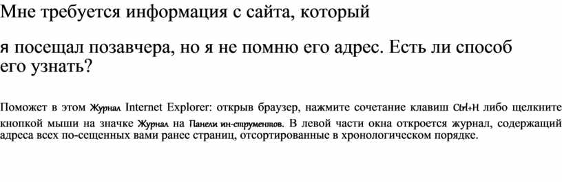 Поможет в этом Журнал Internet Explorer: открыв браузер, нажмите сочетание клавиш Ctrl+H либо щелкните кнопкой мыши на значке Журнал на Панели ин-струментов. В левой части окна откроется журнал, содержащий адреса всех по-сещенных вами ранее страниц, отсортированные в хронологическом порядке.