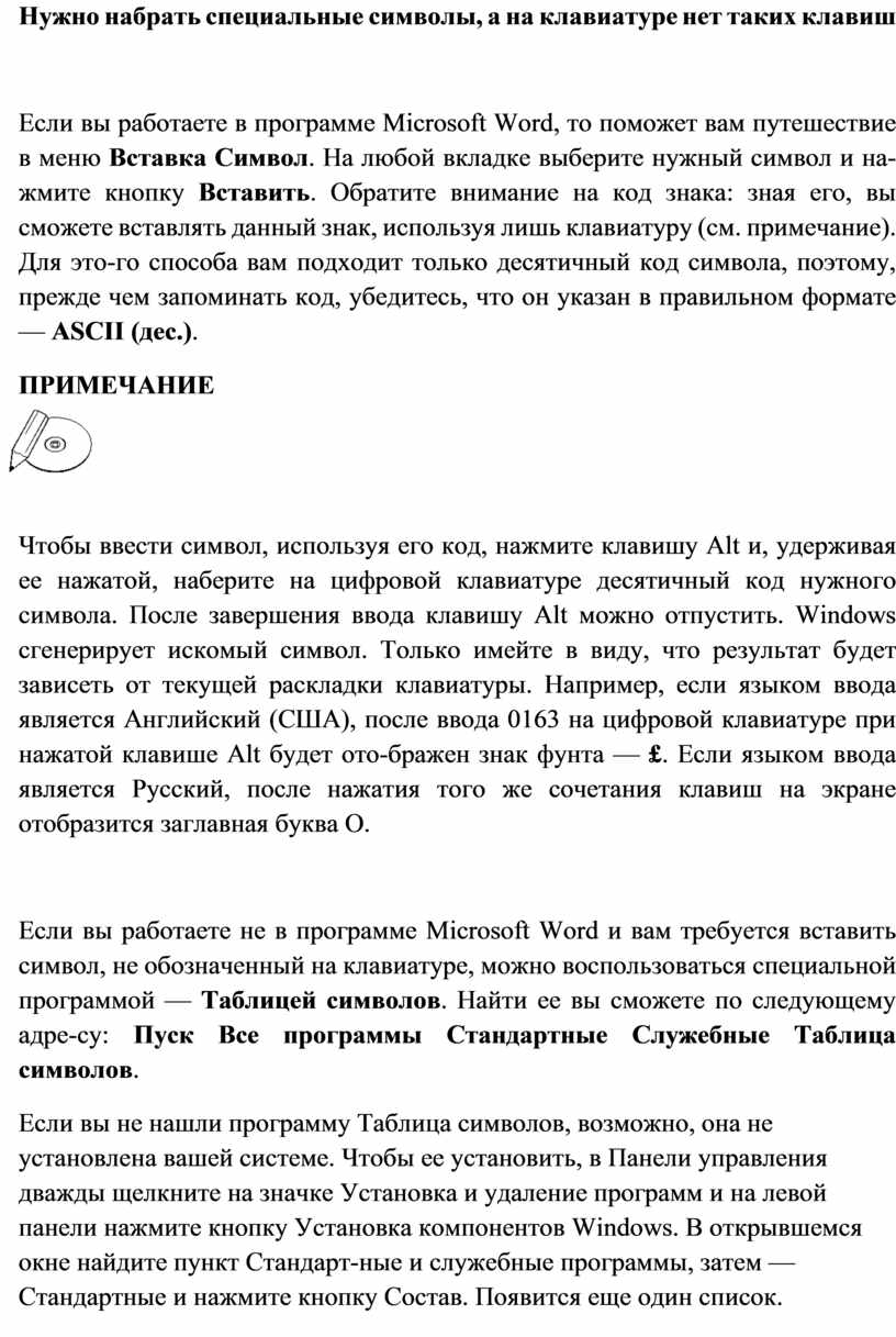 Если вы работаете не в программе Microsoft Word и вам требуется вставить символ, не обозначенный на клавиатуре, можно воспользоваться специальной программой — Таблицей символов. Найти ее вы сможете по следующему адре-су: Пуск Все программы Стандартные Служебные Таблица символов.