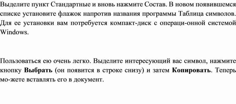Если вы не нашли программу Таблица символов, возможно, она не установлена вашей системе. Чтобы ее установить, в Панели управления дважды щелкните на значке Установка и удаление программ и на левой панели нажмите кнопку Установка компонентов Windows. В открывшемся окне найдите пункт Стандарт-ные и служебные программы, затем — Стандартные и нажмите кнопку Состав. Появится еще один список. Выделите пункт Стандартные и вновь нажмите Состав. В новом появившемся списке установите флажок напротив названия программы Таблица символов. Для ее установки вам потребуется компакт-диск с операци-онной системой Windows.