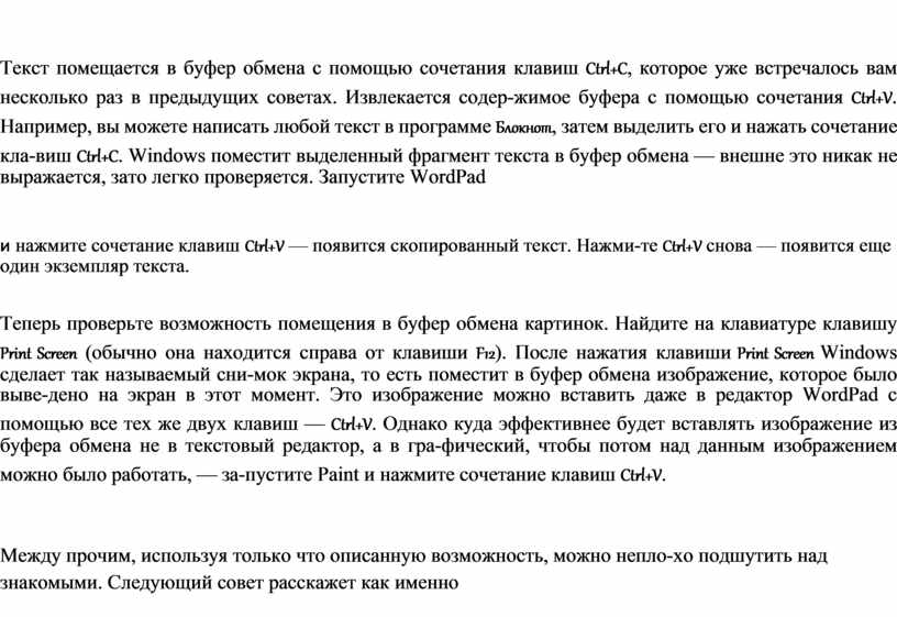 Текст помещается в буфер обмена с помощью сочетания клавиш Ctrl+C, которое уже встречалось вам несколько раз в предыдущих советах. Извлекается содер-жимое буфера с помощью сочетания Ctrl+V. Например, вы можете написать любой текст в программе Блокнот, затем выделить его и нажать сочетание кла-виш Ctrl+C. Windows поместит выделенный фрагмент текста в буфер обмена — внешне это никак не выражается, зато легко проверяется. Запустите WordPad