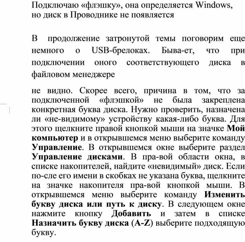 не видно. Скорее всего, причина в том, что за подключенной «флэшкой» не была закреплена конкретная буква диска. Нужно проверить, назначена ли «не-видимому» устройству какая-либо буква. Для этого щелкните правой кнопкой мыши на значке Мой компьютер и в открывшемся меню выберите команду Управление. В открывшемся окне выберите раздел Управление дисками. В пра-вой области окна, в списке накопителей, найдите «невидимый» диск. Если по-сле его имени в скобках не указана буква, щелкните на значке накопителя пра-вой кнопкой мыши. В открывшемся меню выберите команду Изменить букву диска или путь к диску. В следующем окне нажмите кнопку Добавить и затем в списке Назначить букву диска (A-Z) выберите подходящую букву.