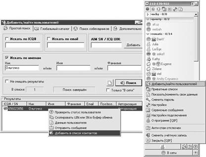 Затем добавьте в список контактов пользователей, с которыми вы желаете об-щаться. Для этого два раза щелкните кнопкой мыши на значке в виде зеленого цветка. Откроется главное окно QIP, дальнейшая последовательность действий показана на рис. 6.8.