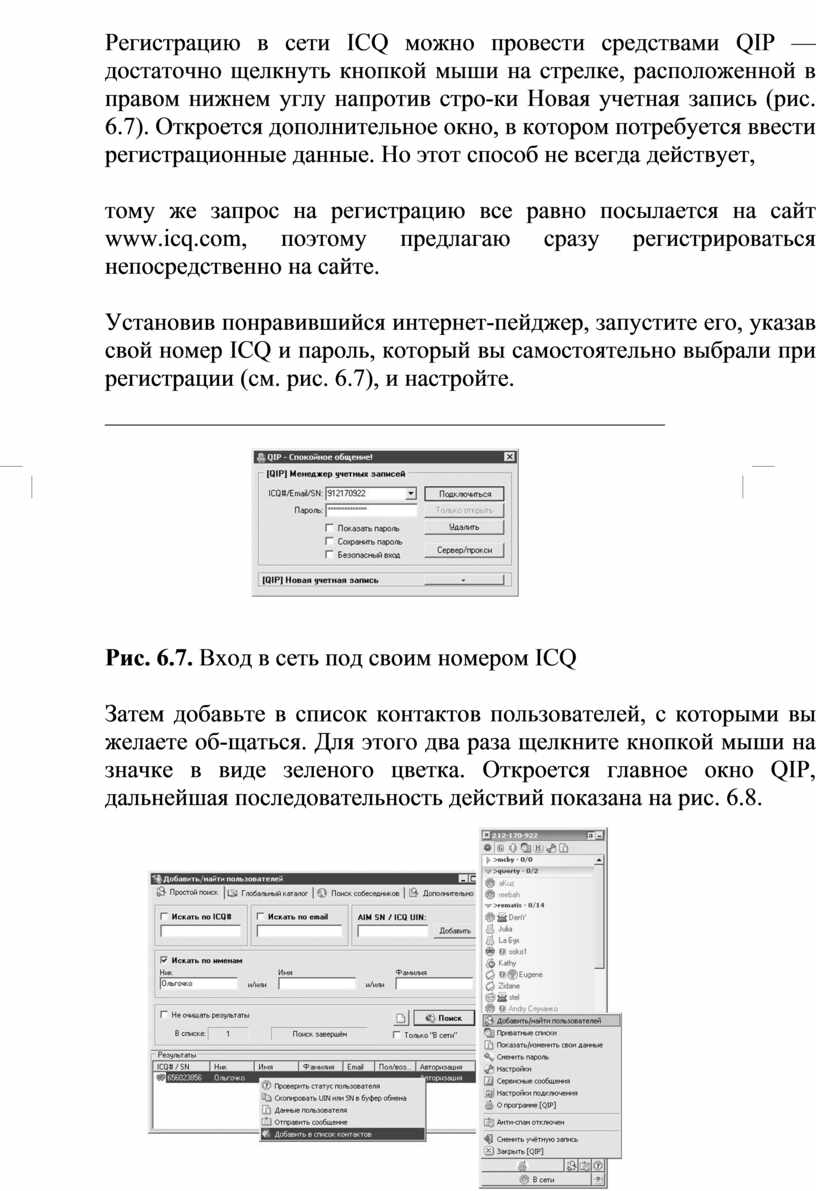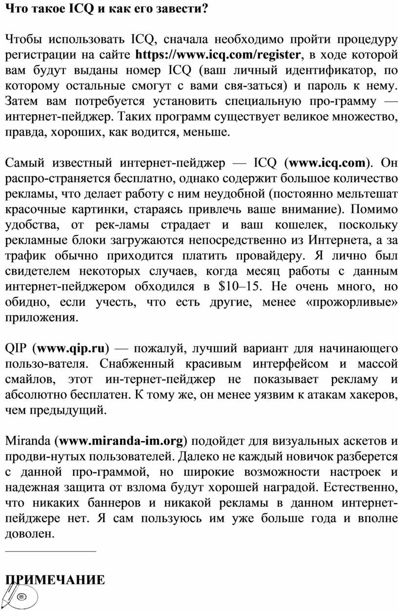 Чтобы использовать ICQ, сначала необходимо пройти процедуру регистрации на сайте https://www.icq.com/register, в ходе которой вам будут выданы номер ICQ (ваш личный идентификатор, по которому остальные смогут с вами свя-заться) и пароль к нему. Затем вам потребуется установить специальную про-грамму — интернет-пейджер. Таких программ существует великое множество, правда, хороших, как водится, меньше.