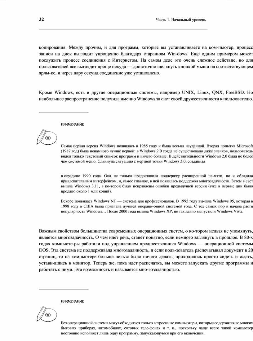 Важным свойством большинства современных операционных систем, о ко-тором нельзя не упомянуть, является многозадачность. О чем идет речь, станет понятно, если немного заглянуть в прошлое. В 80-х годах компьюте-ры работали под управлением предшественника Windows — операционной системы DOS. Эта система не поддерживала многозадачность, и если поль-зователь распечатывал документ в 20 страниц, то на компьютере больше нельзя было ничего делать, приходилось просто сидеть и ждать, устави-вшись в монитор. Теперь же, пока идет распечатка, вы можете запускать другие программы и работать с ними. Эта возможность и называется мно-гозадачностью.