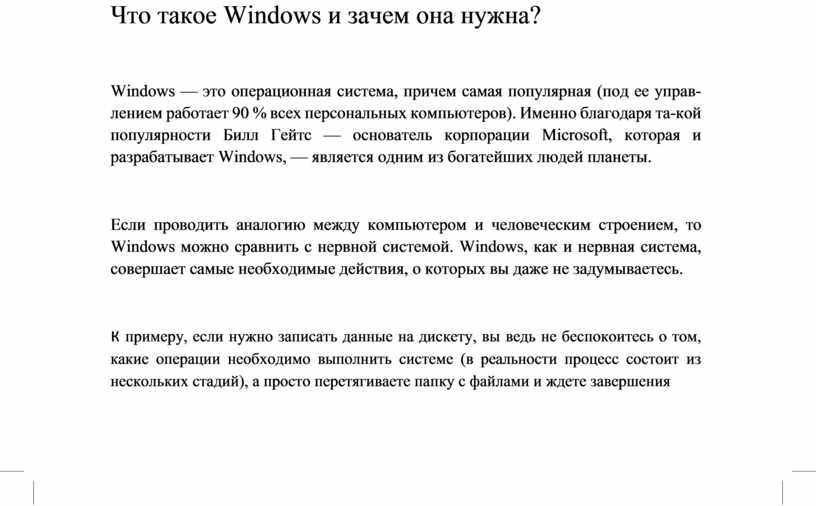 Windows — это операционная система, причем самая популярная (под ее управ-лением работает 90 % всех персональных компьютеров). Именно благодаря та-кой популярности Билл Гейтс — основатель корпорации Microsoft, которая и разрабатывает Windows, — является одним из богатейших людей планеты.