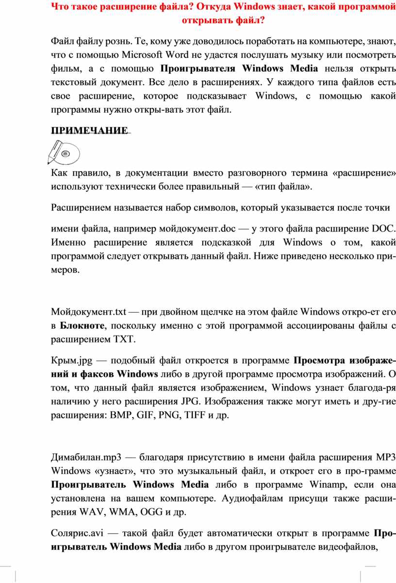 имени файла, например мойдокумент.doc — у этого файла расширение DOC. Именно расширение является подсказкой для Windows о том, какой программой следует открывать данный файл. Ниже приведено несколько при-меров.