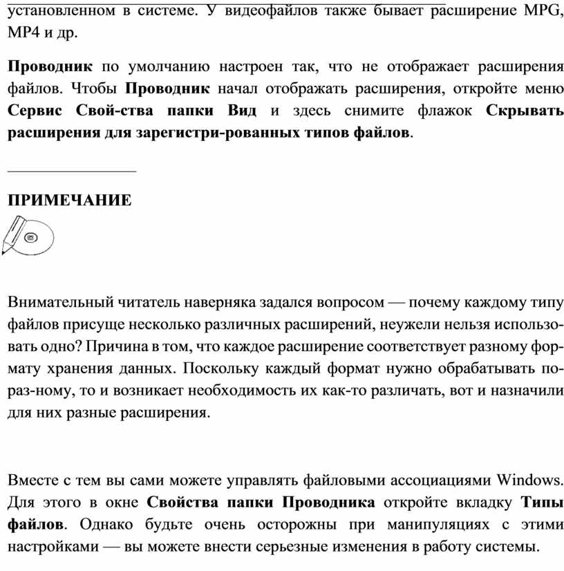 Внимательный читатель наверняка задался вопросом — почему каждому типу файлов присуще несколько различных расширений, неужели нельзя использо-вать одно? Причина в том, что каждое расширение соответствует разному фор-мату хранения данных. Поскольку каждый формат нужно обрабатывать по-раз-ному, то и возникает необходимость их как-то различать, вот и назначили для них разные расширения.