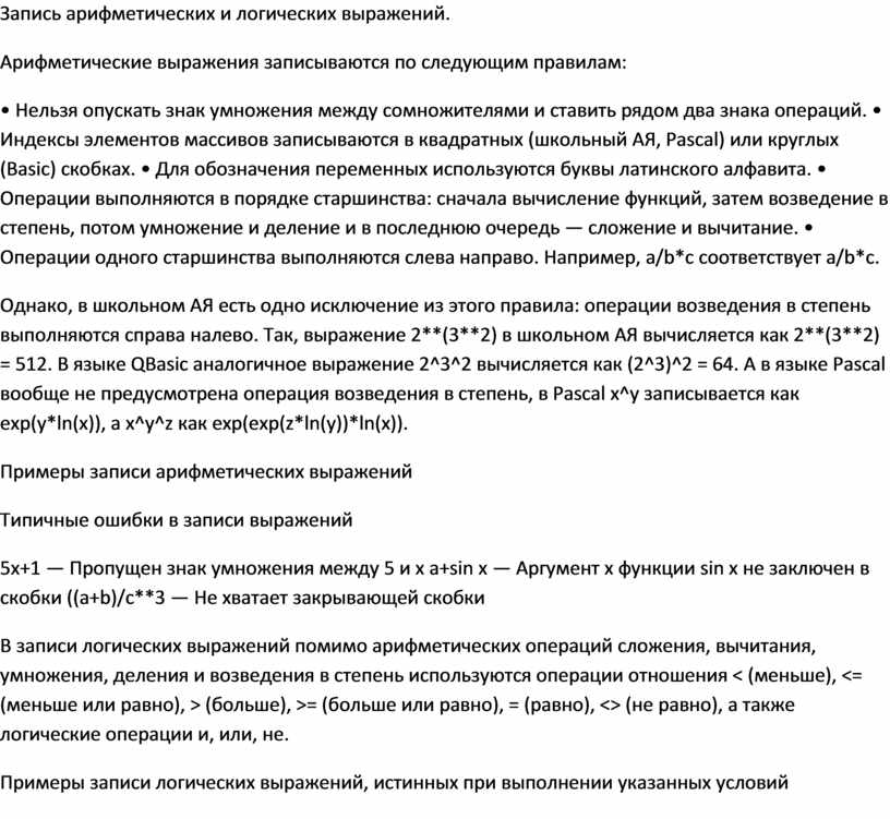 Запись арифметических и логических выражений.