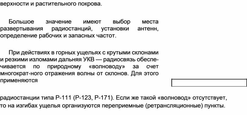 радиостанции типа Р-111 (Р-123, Р-171). Если же такой «волновод» отсутствует, то на изгибах ущелья организуются переприемные (ретрансляционные) пункты.