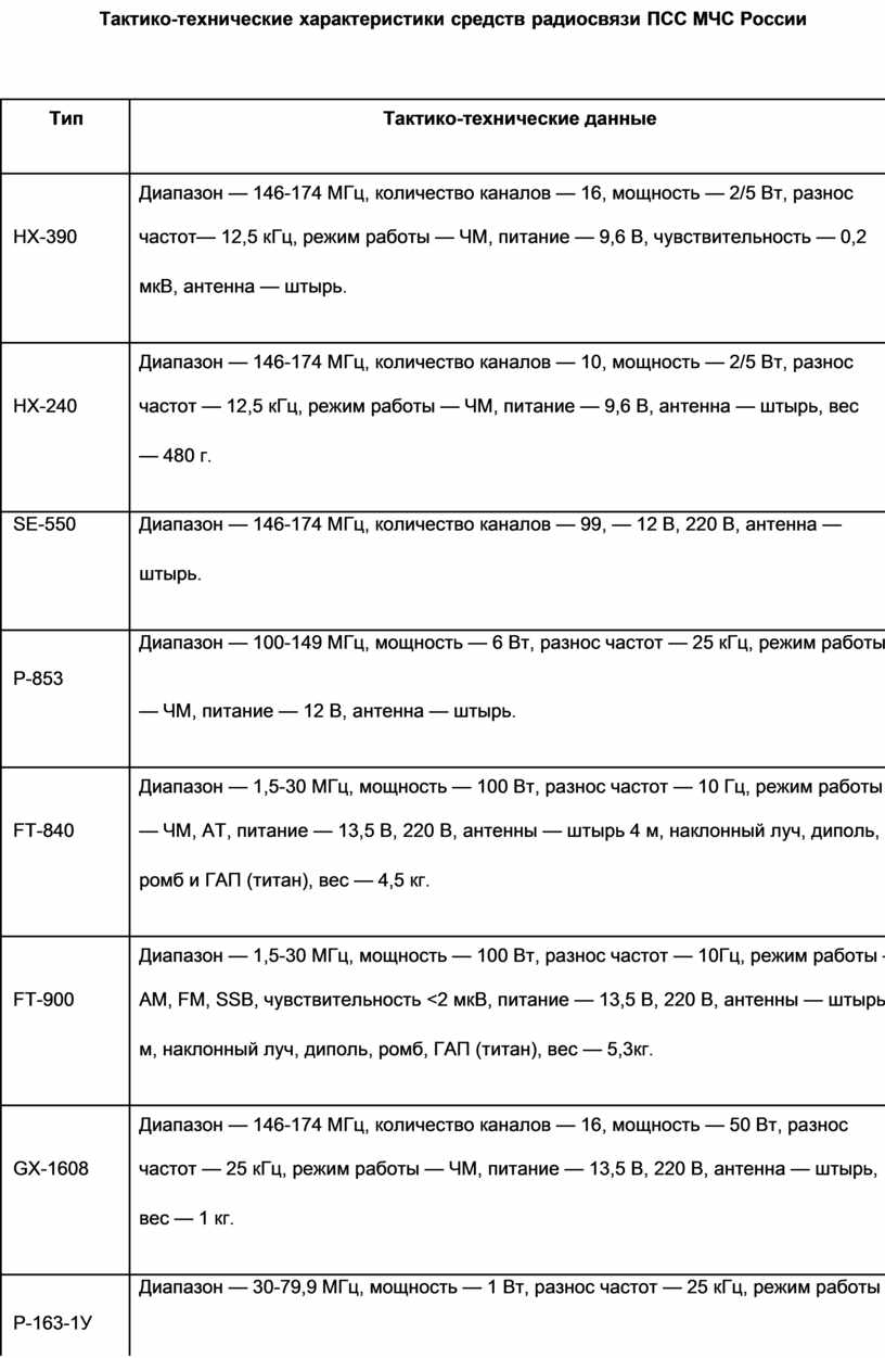 Тактико-технические характеристики средств радиосвязи ПСС МЧС России |