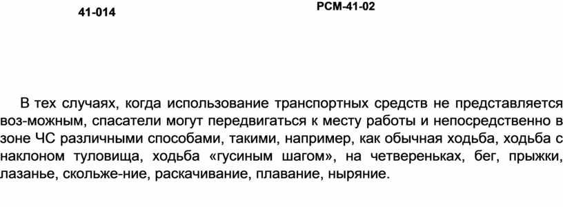 В тех случаях, когда использование транспортных средств не представляется воз-можным, спасатели могут передвигаться к месту работы и непосредственно в зоне ЧС различными способами, такими, например, как обычная ходьба, ходьба с наклоном туловища, ходьба «гусиным шагом», на четвереньках, бег, прыжки, лазанье, скольже-ние, раскачивание, плавание, ныряние.