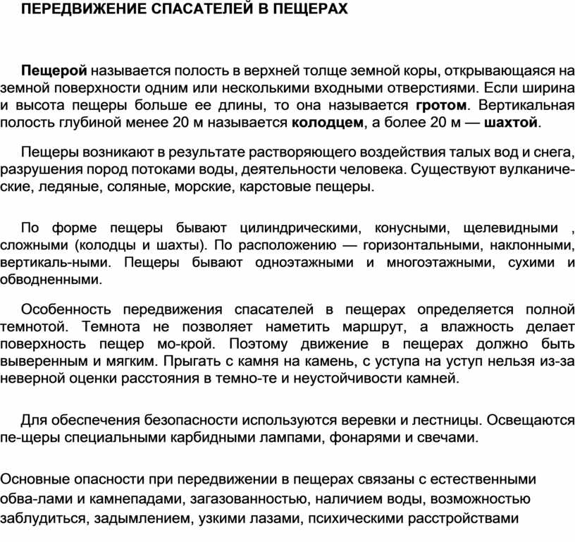 Основные опасности при передвижении в пещерах связаны с естественными обва-лами и камнепадами, загазованностью, наличием воды, возможностью заблудиться, задымлением, узкими лазами, психическими расстройствами