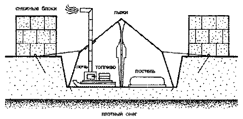В условиях многоснежной зимы спасатели должны уметь устраивать укрытия в сне-гу. Самое простое из них — яма, вырытая вокруг дерева, размеры которой зависят от количества людей. Сверху яму необходимо закрыть ветками, плотной тканью, засы-пать снегом для лучшей теплоизоляции. Можно построить снежную пещеру, снежную землянку, снежную траншею. При входе в снежное убежище следует очистить одежду от снега и грязи, взять с собой лопату или нож, которые могут быть использованы для проделывания вентиляционных отверстий и прохода в случае обрушения снега.