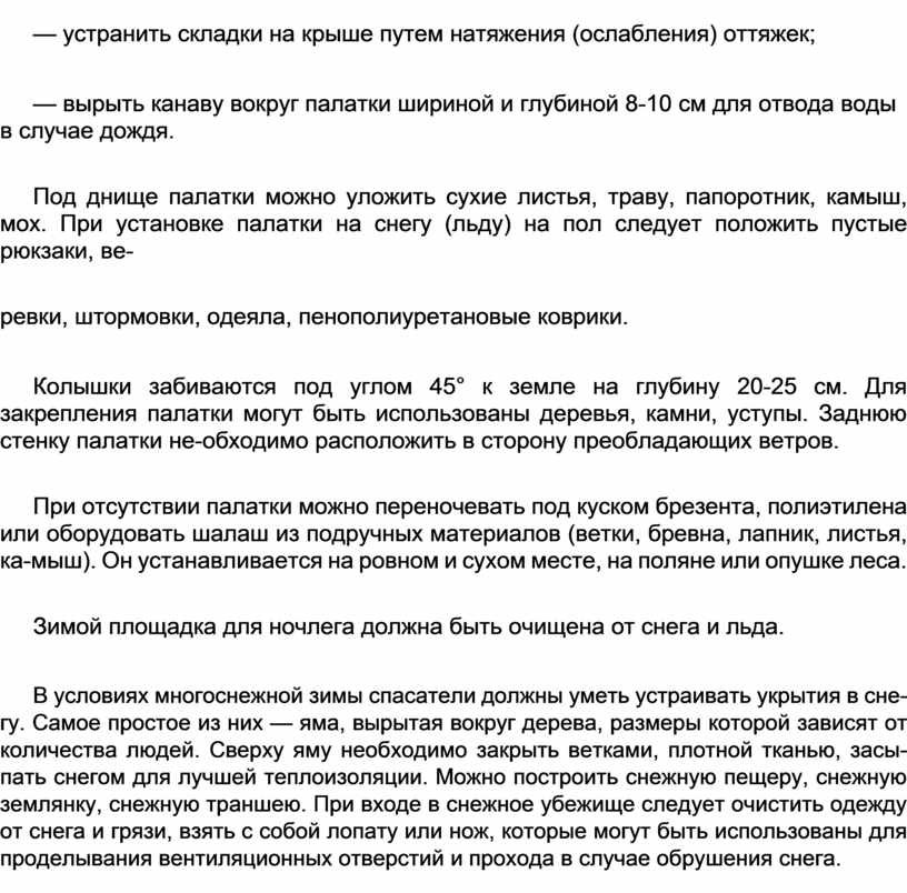 зя устраивать бивуак в высохших руслах горных рек, у отмели , в густом кустарнике, хвойных зарослях, вблизи сухих, дуплистых, гнилых деревьев, в зарослях цветущего рододендрона. После удаления с площадки камней, веток, мусора и ее выравнивания спасатели могут приступить к установке палатки.