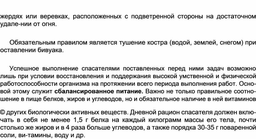 © других биологически активных веществ. Дневной рацион спасателя должен вклю-чать в себя не менее 1,5 г белка на каждый килограмм массы его тела, почти столько же жиров и в 4 раза больше углеводов, а также порядка 30-35 г поваренной соли, ви-тамины, воду и др.