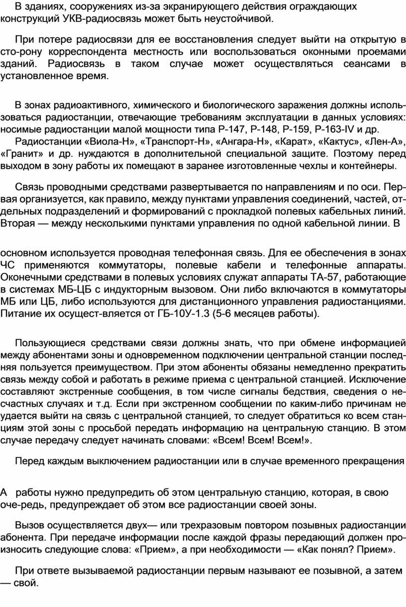 В  зонах радиоактивного, химического и биологического заражения должны исполь-зоваться радиостанции, отвечающие требованиям эксплуатации в данных условиях: носимые радиостанции малой мощности типа Р-147, Р-148, Р-159, P-163-IV и др.