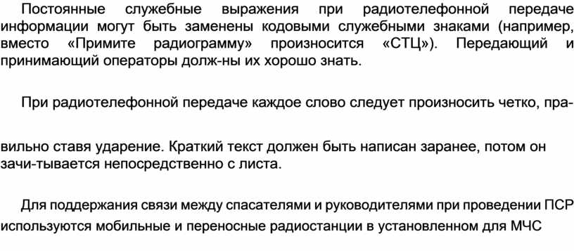 Постоянные служебные выражения при радиотелефонной передаче информации могут быть заменены кодовыми служебными знаками (например, вместо «Примите радиограмму» произносится «СТЦ»). Передающий и принимающий операторы долж-ны их хорошо знать.