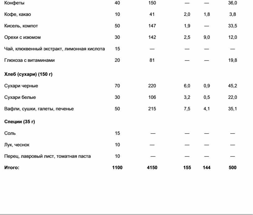 Рацион питания спасателя, выполняющего работы в сложных условиях (энергозатраты 4150 ккал)