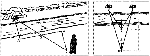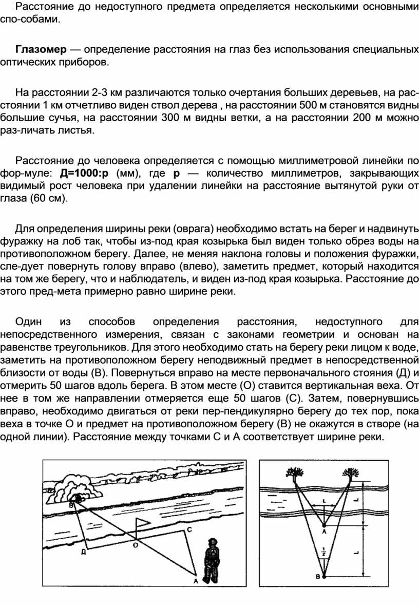 Один из способов определения расстояния, недоступного для непосредственного измерения, связан с законами геометрии и основан на равенстве треугольников. Для этого необходимо стать на берегу реки лицом к воде, заметить на противоположном берегу неподвижный предмет в непосредственной близости от воды (В). Повернуться вправо на месте первоначального стояния (Д) и отмерить 50 шагов вдоль берега. В этом месте (О) ставится вертикальная веха. От нее в том же направлении отмеряется еще 50 шагов (С). Затем, повернувшись вправо, необходимо двигаться от реки пер-пендикулярно берегу до тех пор, пока веха в точке О и предмет на противоположном берегу (В) не окажутся в створе (на одной линии). Расстояние между точками С и А соответствует ширине реки.