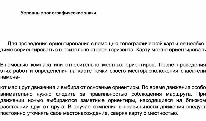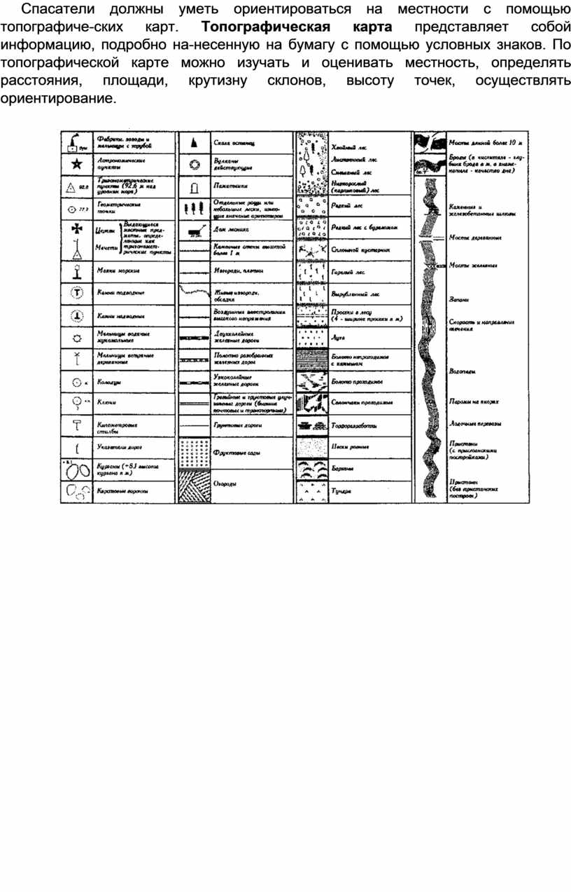 Спасатели должны уметь ориентироваться на местности с помощью топографиче-ских карт. Топографическая карта представляет собой информацию, подробно на-несенную на бумагу с помощью условных знаков. По топографической карте можно изучать и оценивать местность, определять расстояния, площади, крутизну склонов, высоту точек, осуществлять ориентирование.