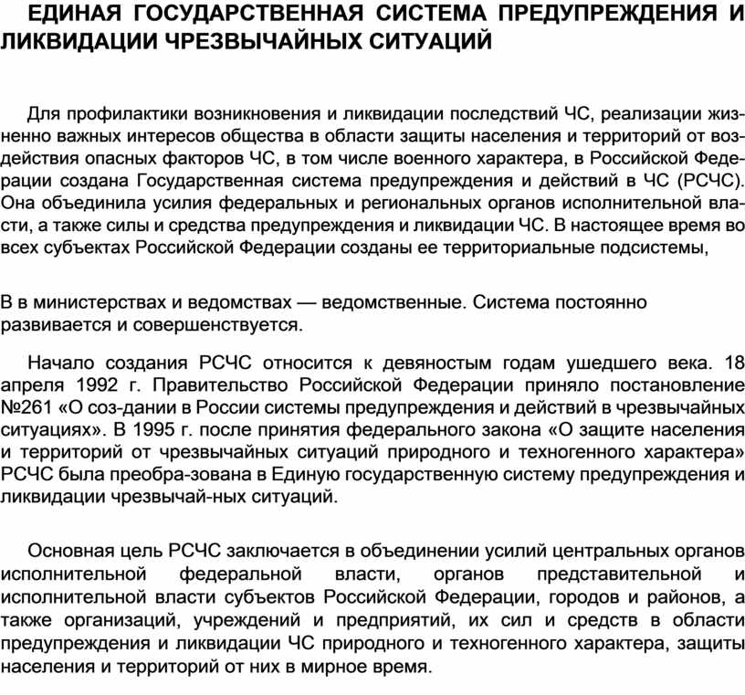 Начало создания РСЧС относится к девяностым годам ушедшего века. 18 апреля 1992 г. Правительство Российской Федерации приняло постановление №261 «О соз-дании в России системы предупреждения и действий в чрезвычайных ситуациях». В 1995 г. после принятия федерального закона «О защите населения и территорий от чрезвычайных ситуаций природного и техногенного характера» РСЧС была преобра-зована в Единую государственную систему предупреждения и ликвидации чрезвычай-ных ситуаций.