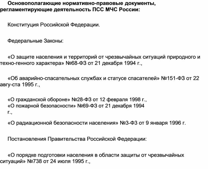 Основополагающие нормативно-правовые документы, регламентирующие деятельность ПСС МЧС России: