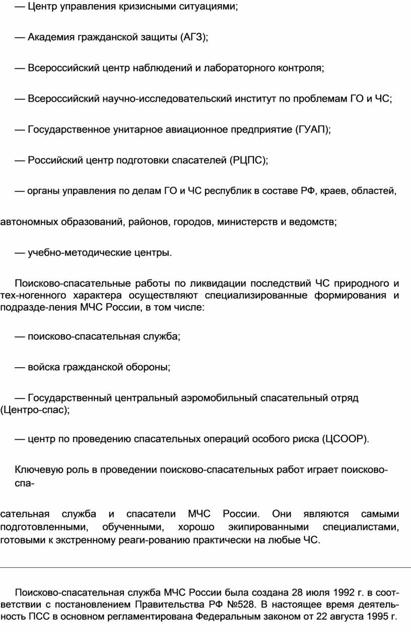 Поисково-спасательная служба МЧС России была создана 28 июля 1992 г. в соот-ветствии с постановлением Правительства РФ №528. В настоящее время деятель-ность ПСС в основном регламентирована Федеральным законом от 22 августа 1995 г.