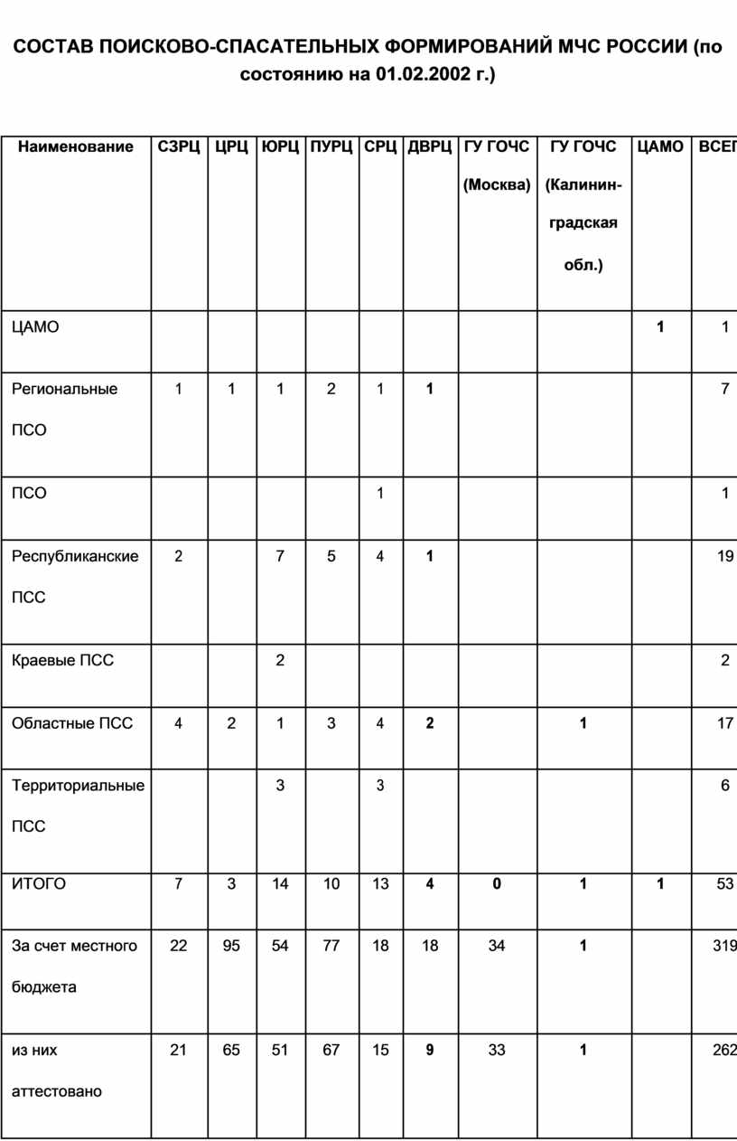 СОСТАВ ПОИСКОВО-СПАСАТЕЛЬНЫХ ФОРМИРОВАНИЙ МЧС РОССИИ (по состоянию на 01.02.2002 г.)