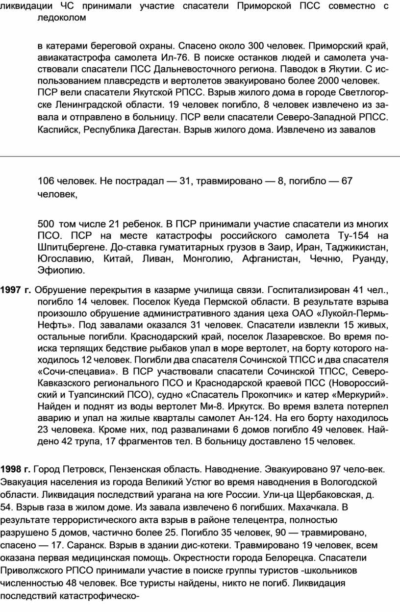 1997 г. Обрушение перекрытия в казарме училища связи. Госпитализирован 41 чел., погибло 14 человек. Поселок Куеда Пермской области. В результате взрыва произошло обрушение административного здания цеха ОАО «Лукойл-Пермь-Нефть». Под завалами оказался 31 человек. Спасатели извлекли 15 живых, остальные погибли. Краснодарский край, поселок Лазаревское. Во время по-иска терпящих бедствие рыбаков упал в море вертолет, на борту которого на-ходилось 12 человек. Погибли два спасателя Сочинской ТПСС и два спасателя «Сочи-спецавиа». В ПСР участвовали спасатели Сочинской ТПСС, Северо-Кавказского регионального ПСО и Краснодарской краевой ПСС (Новороссий-ский и Туапсинский ПСО), судно «Спасатель Прокопчик» и катер «Меркурий». Найден и поднят из воды вертолет Ми-8. Иркутск. Во время взлета потерпел аварию и упал на жилые кварталы самолет Ан-124. На его борту находилось 23 человека. Кроме них, под развалинами 6 домов погибло 49 человек. Най-дено 42 трупа, 17 фрагментов тел. В больницу доставлено 15 человек.