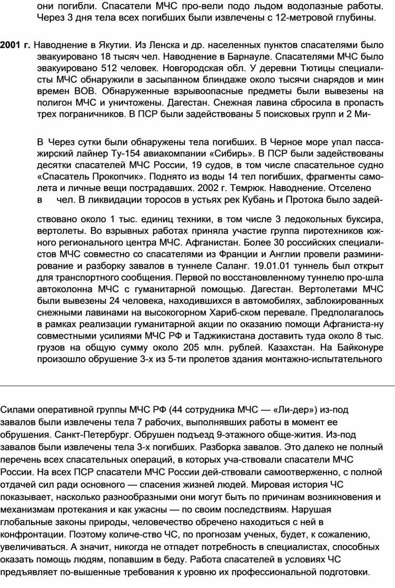 2001 г. Наводнение в Якутии. Из Ленска и др. населенных пунктов спасателями было эвакуировано 18 тысяч чел. Наводнение в Барнауле. Спасателями МЧС было эвакуировано 512 человек. Новгородская обл. У деревни Тютицы специали-сты МЧС обнаружили в засыпанном блиндаже около тысячи снарядов и мин времен ВОВ. Обнаруженные взрывоопасные предметы были вывезены на полигон МЧС и уничтожены. Дагестан. Снежная лавина сбросила в пропасть трех пограничников. В ПСР были задействованы 5 поисковых групп и 2 Ми-