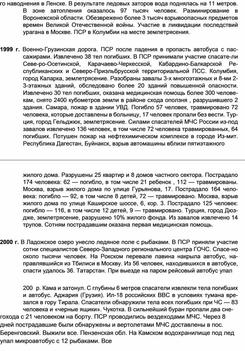 2000 г. В Ладожское озеро унесло ледяное поле с рыбаками. В ПСР приняли участие сотни специалистов Северо-Западного регионального центра ГОЧС. Спасе-но около тысячи человек. На Рокском перевале лавина накрыла автобус, на-правлявшийся из Тбилиси в Москву. Из 56 человек, находившихся в автобусе, спасти удалось 36. Татарстан. При выезде на паром рейсовый автобус упал