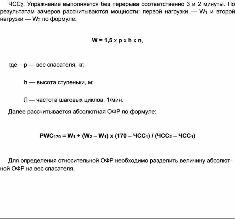 Общая физическая работоспособность определяется с использованием степ-теста методом PWC170 . Во время эксперимента спасатель два раза подвергается воздействию нагрузки разной мощности. В первом случае он «попеременно», то на левой, то на правой ноге поднимается на ступеньку высотой 0,45 м и опуска-ется с нее на уровень земли с частотой 22,5 шаговых циклов в минуту; во втором случае — с частотой 30-40 шаговых циклов в минуту. В обоих случаях после воз-действий нагрузки у спасателя производится замер частоты сердечных сокраще-ний — ЧСС1 и ЧСС2. Упражнение выполняется без перерыва соответственно 3 и 2 минуты. По результатам замеров рассчитываются мощности: первой нагрузки — W1 и второй нагрузки — W2 по формуле: