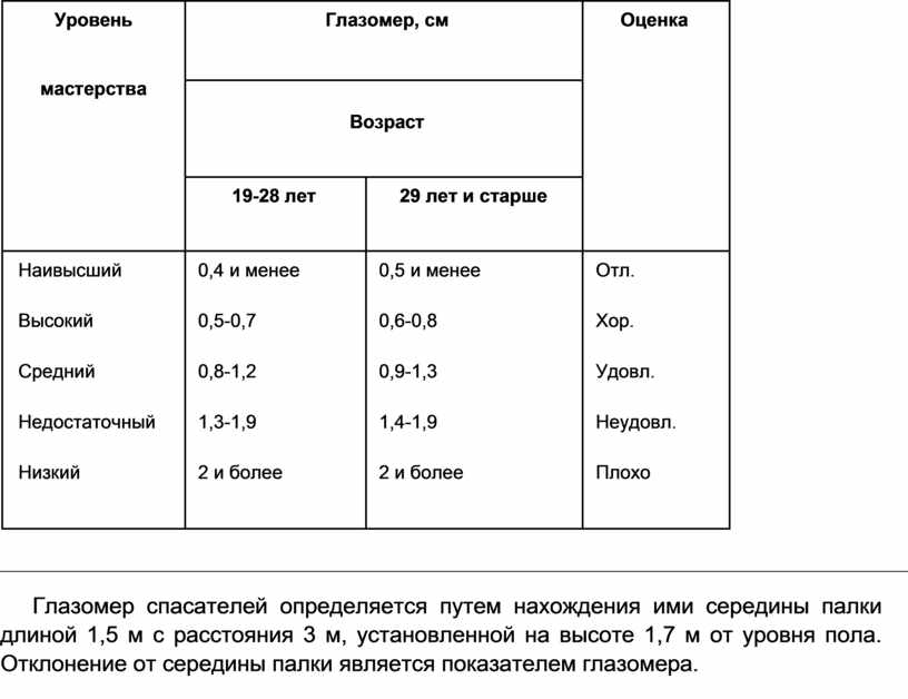 Глазомер спасателей определяется путем нахождения ими середины палки длиной 1,5 м с расстояния 3 м, установленной на высоте 1,7 м от уровня пола. Отклонение от середины палки является показателем глазомера.