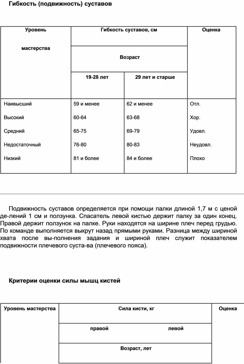 Подвижность суставов определяется при помощи палки длиной 1,7 м с ценой де-лений 1 см и ползунка. Спасатель левой кистью держит палку за один конец. Правой держит ползунок на палке. Руки находятся на ширине плеч перед грудью. По команде выполняется выкрут назад прямыми руками. Разница между шириной хвата после вы-полнения задания и шириной плеч служит показателем подвижности плечевого суста-ва (плечевого пояса).